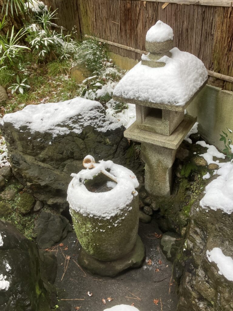 一夜明けても、お庭の降り蹲踞と織部燈篭は雪をかぶっていました。